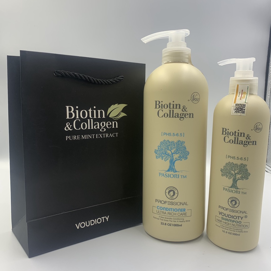 - Dầu gội Biotin & Collagen chứa Vitamin B7 giúp làm dày tóc, ngăn ngừa tóc gẫy rụng, kích thích mọc tóc. Dầu xả biotin cung cấp dưỡng chất phục hồi từ sâu bên trong sợi tóc. Cung cấp độ ẩm giúp sợi tóc trắc khỏe, sáng bóng mềm mượt.
