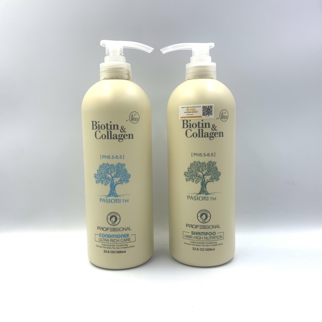 -Dầu gội xả Biotin & Collagen New với dung tích từ 500ml - 1000ml chuyên nghiệp dùng cho Salon. Dầu gội biotin với mùi hương thơm quyến rũ ngây ngất, cho khách cảm giác sảng khoái, thư giãn. Gội xả biotin trắng với dưỡng chất Biotin & Collagen Protein từ dưỡng chất thiên nhiên, bổ sung cho tóc khô xơ hư tổn, giúp tóc suôn mềm mượt và bóng đẹp, dưỡng cho tóc suôn mềm dễ chải. Dầu gội cặp biotin ngăn ngừa tóc gãy rụng do sử dụng hóa chất uốn duỗi nhuộm và tác hại của nhiệt độ cao của máy sấy máy kẹp.
