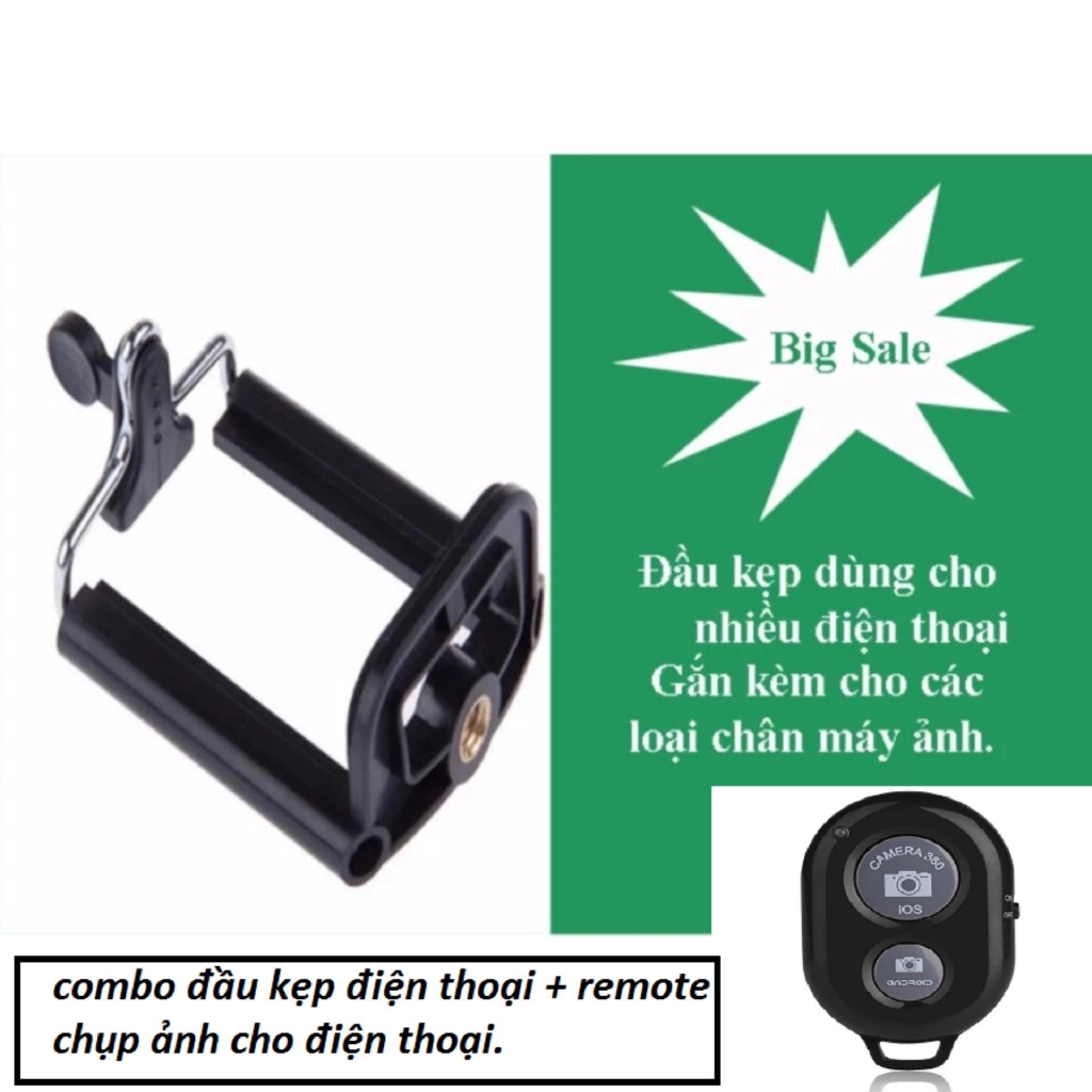 Điện Thoại & Phụ Kiện > Phụ kiện > Phụ kiện selfie > Giá đỡ || combo Đầu kẹp điện thoại cho chân máy ảnh (Đen) + remote chụp ảnh cho điện thoạiCòn hàng