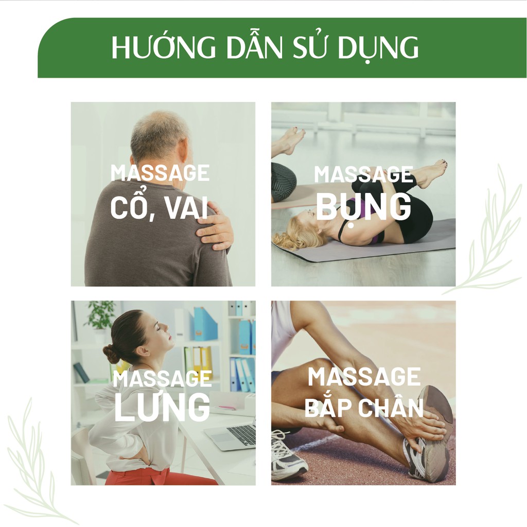 Cho khoảng 5-10 giọt dầu Massage lên vùng cơ bị đau, Massage nhẹ nhàng khoảng 5-15 phút. Nên sử dụng trước khi đi ngủ