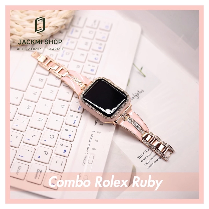 Combo dây rolex ruby và ốp viền đính đá cho Apple Watch series 1/2/3/4/5/6/SE size 38/40/42/44mm