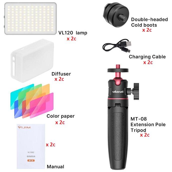 Bộ sản phẩm bao gồm: 1 đèn VL120 Bi-Color, 1 chân tripod MT-08.