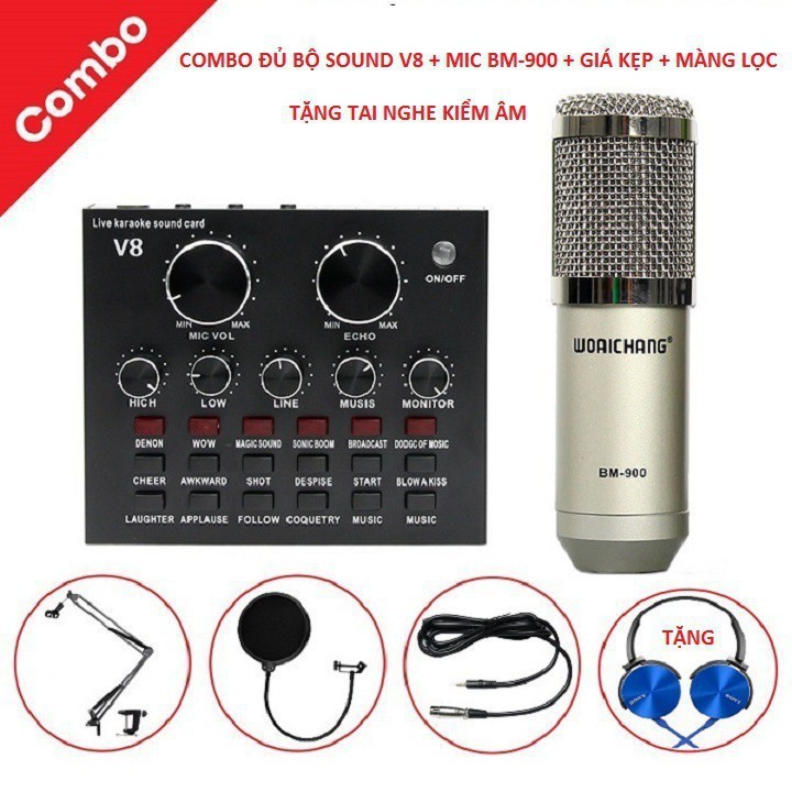 ComBo Đủ Bộ Sound car V8 - Mic BM 900 - Giá Kẹp - Màng lọc - Tặng Tai Nghe Kiểm Âm 2020