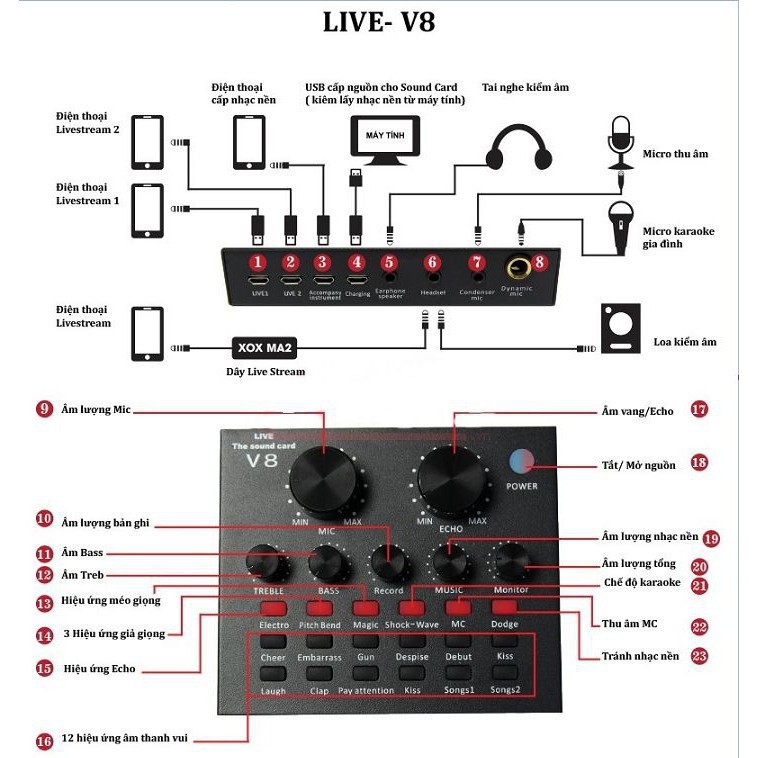 Sound card hiểu nôm na là “Card” Âm Thanh tức là thiết bị dùng để thu nhận, xử lý và phát tín hiệu âm thanh thông qua 1 thiết bị ngoại vi khác. Âm thanh trong máy tính là ở dạng digital (kỹ thuật số) muốn truyền tốt được ra ngoài cần có một thiết bị chuyển digital qua analog (tín hiệu băng tần) vậy nên Sound card thu âm V8 giúp máy bạn thực hiện điều đó.Sound card thu âm V8 là sản phẩm card âm thanh tương thích với nhiều thiết bị như smartphone, laptop, pc, máy tính bảng. Với tính năng làm méo giọng hát, thành giọng trẻ em, người già, Khả năng chèn các hiệu ứng âm thanh vào các đoạn thu như tiếng vỗ tay, tiếng hò reo, nhạc cổ vũ, tiếng chim kêu... với 12 hiệu ứng âm thanh, sẽ đem lại cho bạn trải nghiệm thu âm vô cùng thú vị.