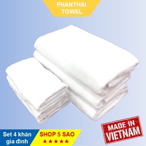 Giới thiệu [Combo gia đình 03] Set 4 khăn: 1 tắm lớn, 1 lau tóc, 2 mặt trắng chất liệu sợi bông/ cotton - Sang sịn mịn