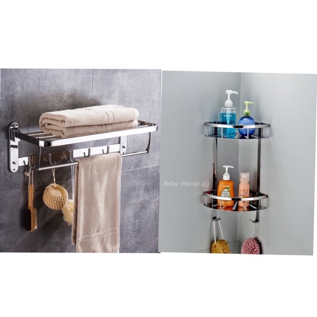 Combo gồm 2 sản phẩm: 1 bộ giàn khăn và 1 bộ kệ góc 2 tầng.- Chất liệu: chuẩn 100% inox 304 cao cấp, sáng bóng, chống hoen rỉ
