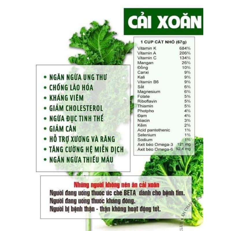 Kale xoăn xanh có rất nhiều dinh dưỡng và công dụng bổ ích, có thể làm salad, ăn sống, làm nước ép, làm sinh tố, snack kale,... Người lớn trẻ nhỏ đều ăn được.