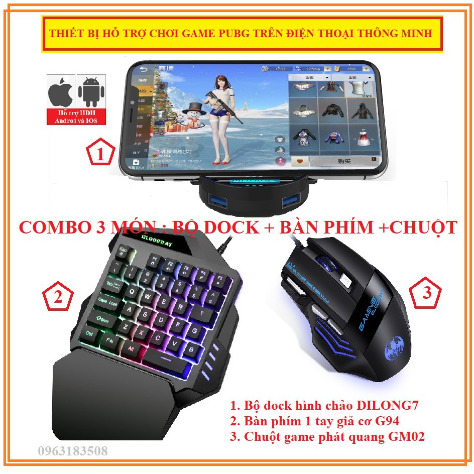 COMBO HỖ TRỢ CHƠI GAME PUBG TRÊN ĐIỆN THOẠI GỒM BỘ CHUYỂN ĐỔI DILONG7 + BÀN PHÍM G94 + CHUỘT QUÀNG GM02