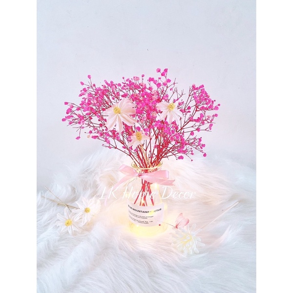 [Combo HOA + LỌ tặng kèm ĐÈN LED và BƯỚM LỤA]Hoa thật được sấy khô và xử lý màu, siêu bền, không héo không tàn , không phải chăm bắm tưới tắm gì nhưng sẽ luôn như tươi như mới , mang lại sức sống và phong cách riêng cho căn phòng nhỏ của bạn