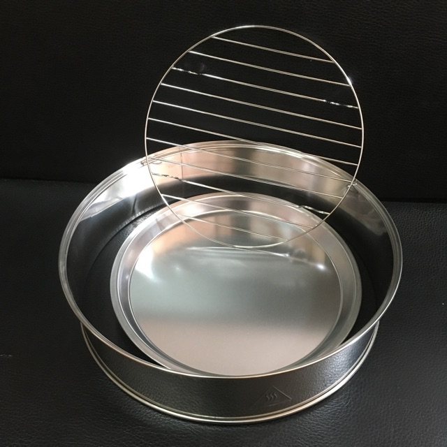 Combo khay vỉ vòng inox dùng nâng thể tích lò nướng tròn thuỷ tinhCombo bộ 3 món: vòng inox, khay chảo inox, vỉ inox.