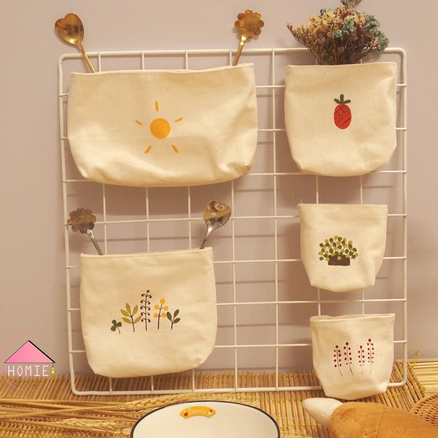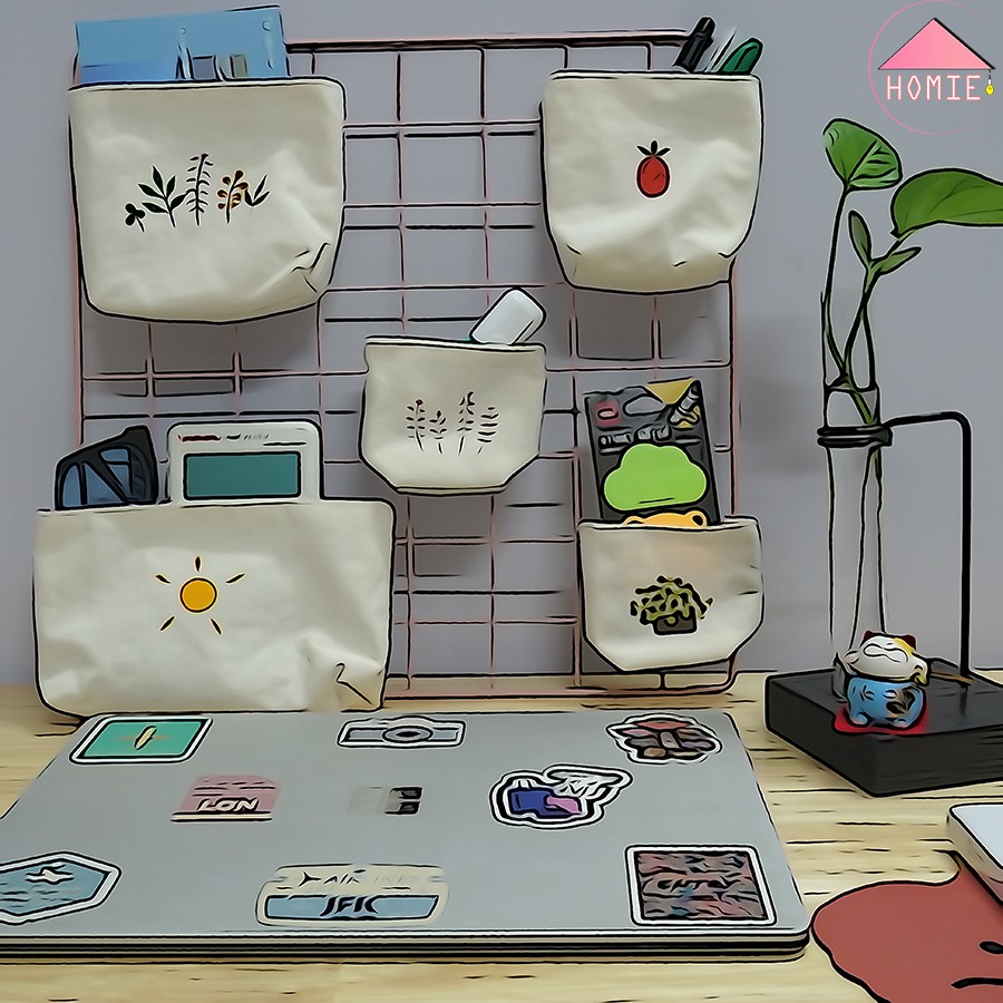 ✔️ 5 túi vải chất liệu canvas in hình xinh xắn. Đặc biệt được may kèm nam châm nên ngoài hít lên khung lưới sắt còn có thể hít lên tủ lạnh, cửa sắt…