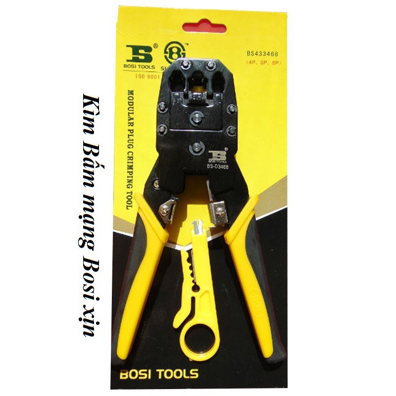 Bộ sản phẩm gồm 3 món :- Kìm bấm mạng BOSI BS-D3468 vàng chất lượng
