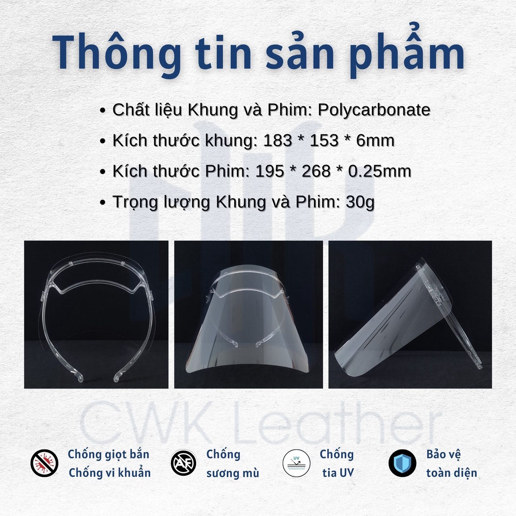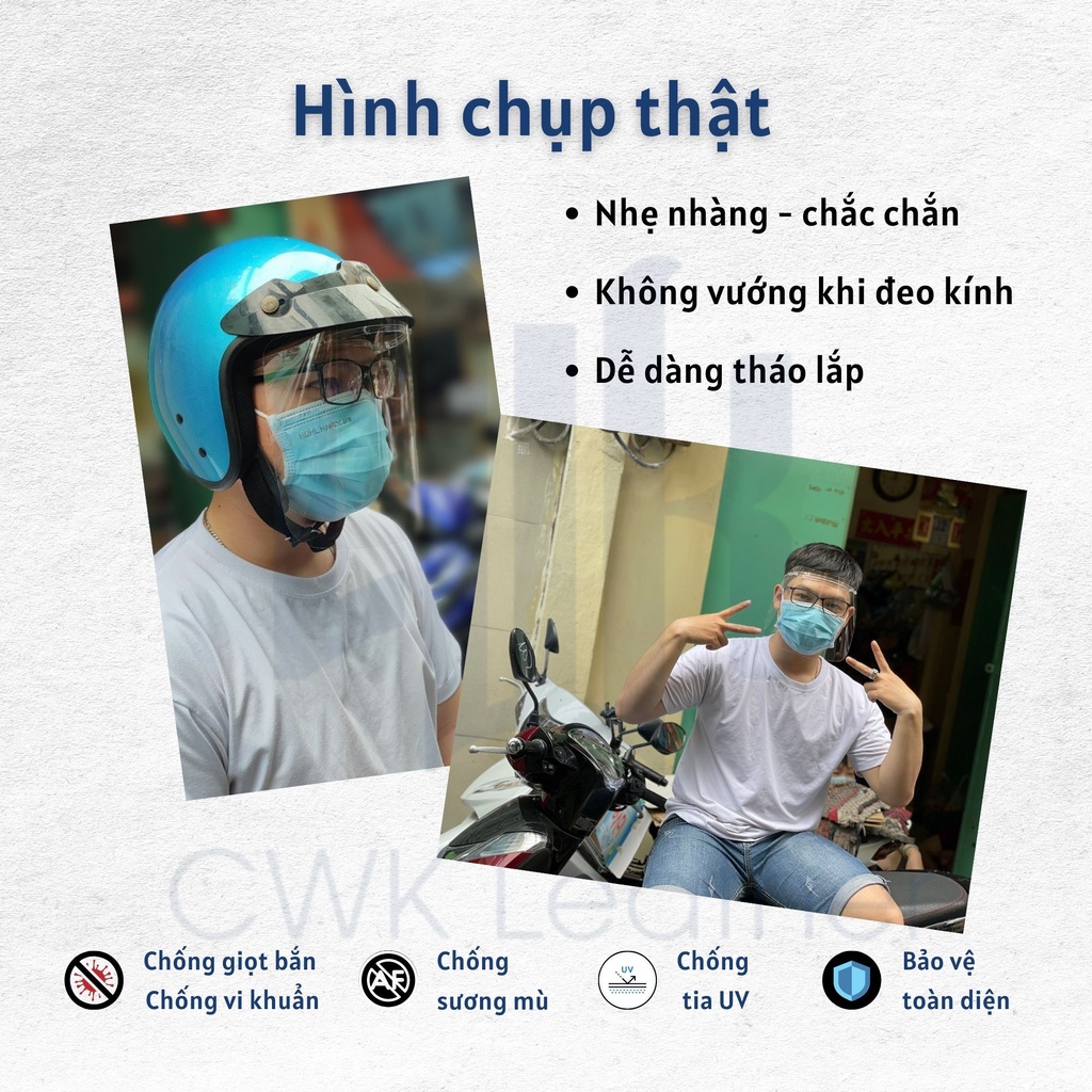 - Màn chắn nhựa phủ hết khuôn mặt, bảo vệ toàn bộ khuôn mặt.