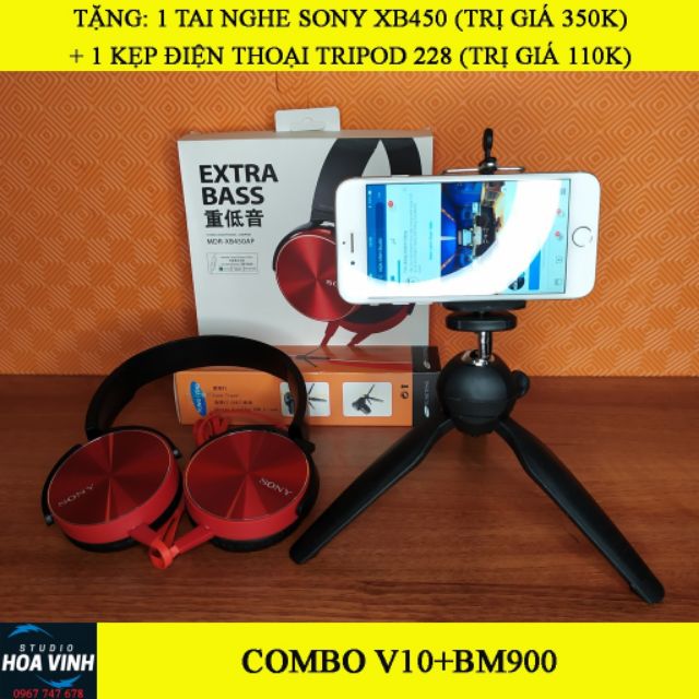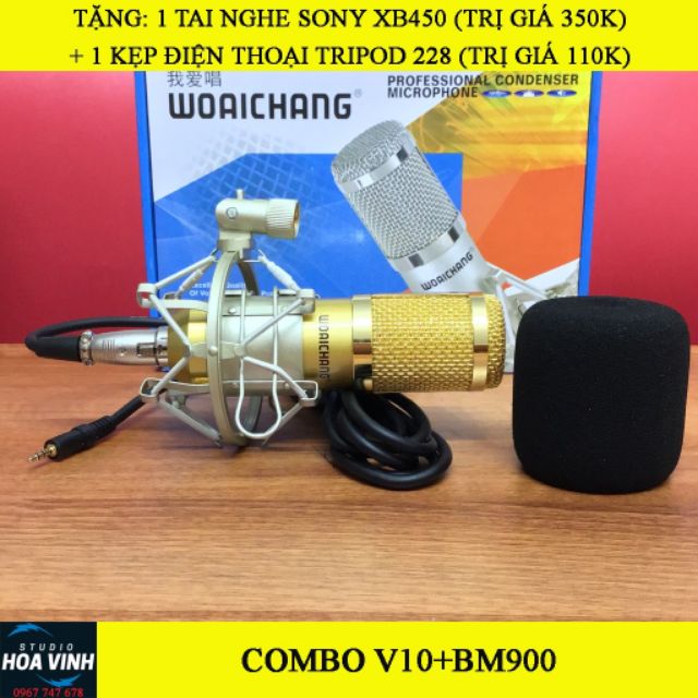 Combo livestream mic Woaichoang BM-900 soundcard V10 bluetooth tặng tai nghe kẹp điện thoại