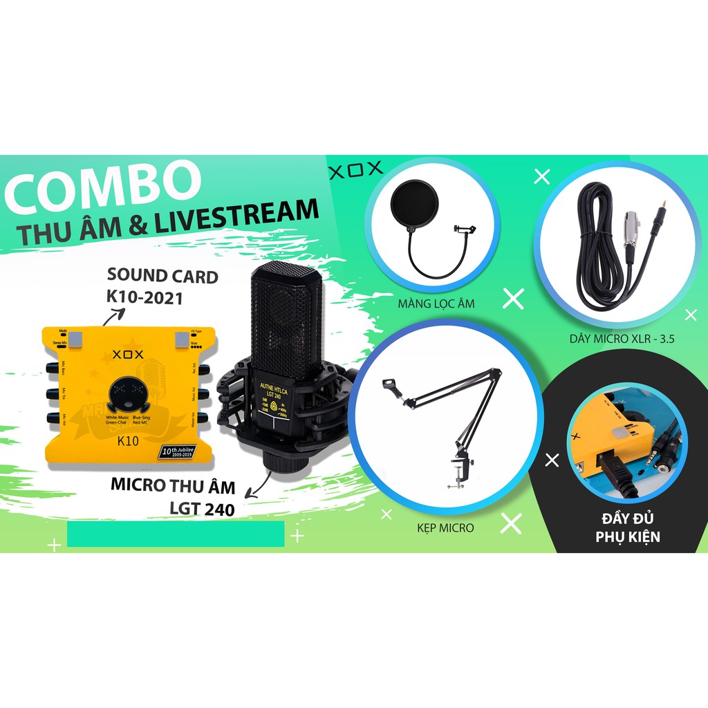 Bộ Combo livestream thu âm karaoke LGt240 Sound card XOX K10 - Full phụ kiện ma1 kẹp micro, màng lọc, tai nghe
