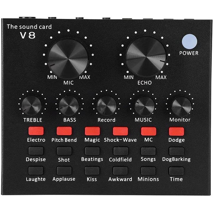 Sound card thu âm V8 là sản phẩm card âm thanh tương thích với nhiều thiết bị như smartphone, laptop, pc, máy tính bảng. Với tính năng làm méo giọng hát, thành giọng trẻ em, người già, Khả năng chèn các hiệu ứng âm thanh vào các đoạn thu như tiếng vỗ tay, tiếng hò reo, nhạc cổ vũ, tiếng chim kêu... với 12 hiệu ứng âm thanh, sẽ đem lại cho bạn trải nghiệm thu âm vô cùng thú vị.