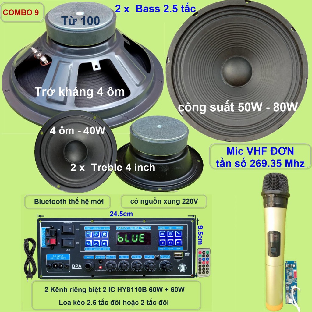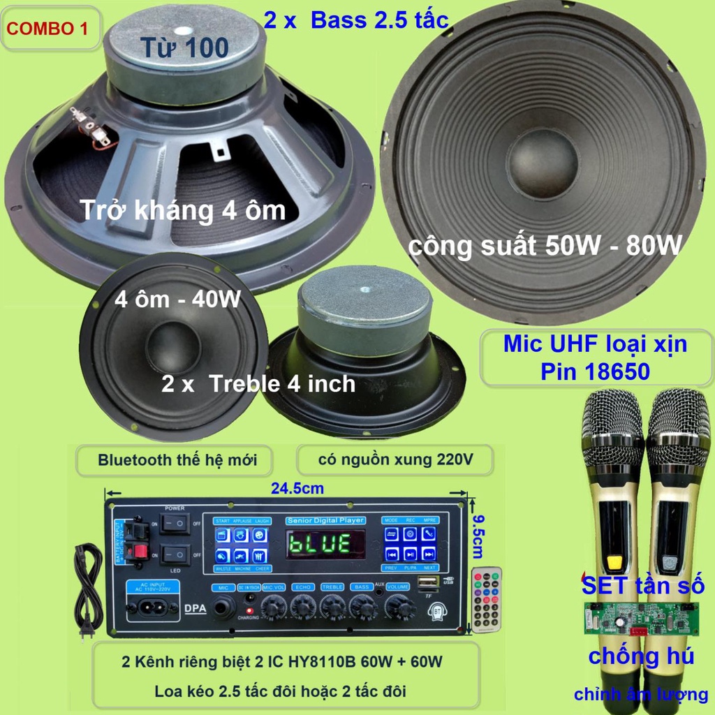 Combo Mạch loa kéo 2.5 tấc đôi 2 IC HY8110B 60W + 60W có nguồn xung 220V - Bluetooth thế hệ mớiCác combo chỉ khác nhau về bộ Micro. Các linh kiện khác của các combo là giống nhau bao gồm: 1 mạch loa kéo + phụ kiện (remote + dây nguồn 220V + dây bình ắc qui + dây loa) + 2 Bass 2.5 tấc + 2 Treble 4 inch