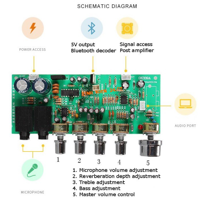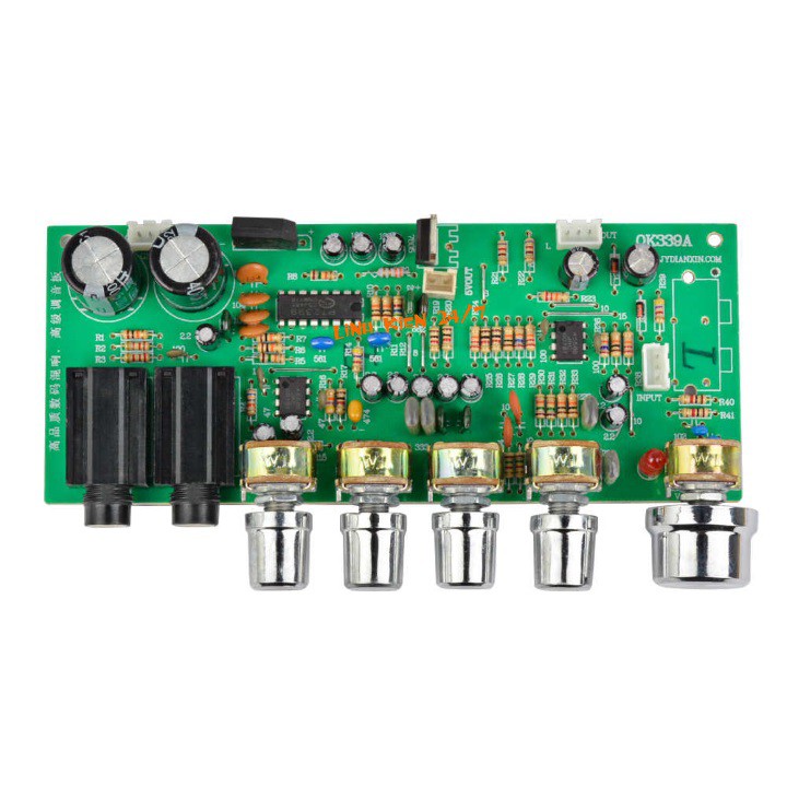 - Mạch khuếch đại micro karaoke OK339 hỗ trợ 2 micro có dây, với chức năng chỉnh âm lượng và echo giúp bạn hiệu chỉnh được độ vang mong muốn. Ngoài ra, mạch còn được tích hợp chip opamp 4558D hỗ trợ điều chỉnh âm sắc volume bass treble.