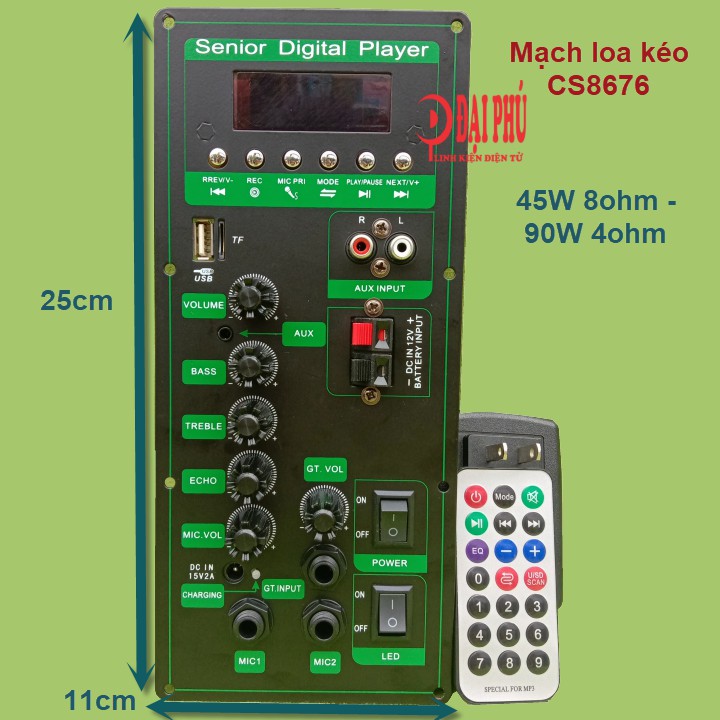 Mạch loa kéo Đại Phú giới thiệu mẫu mạch loa kéo mới dùng cho loa kéo 3 tấc. Mẫu mạch được thiết kế nhỏ gọn (kích thước: 25 x 11 cm) , đẹp với đầy đủ các tính năng bắt Bluetooth và Karaoke (lắp được mic không dây). Mạch sử dụng IC CS8676E có công suất 45W – 90W rất thích hợp cho loa kéo 3 tấc đơn hoặc 2 tấc đôi. Mạch có chức năng sạc bình tự ngắt. Có công tắc Led và nguồn cấp cho Led nháy theo nhạc