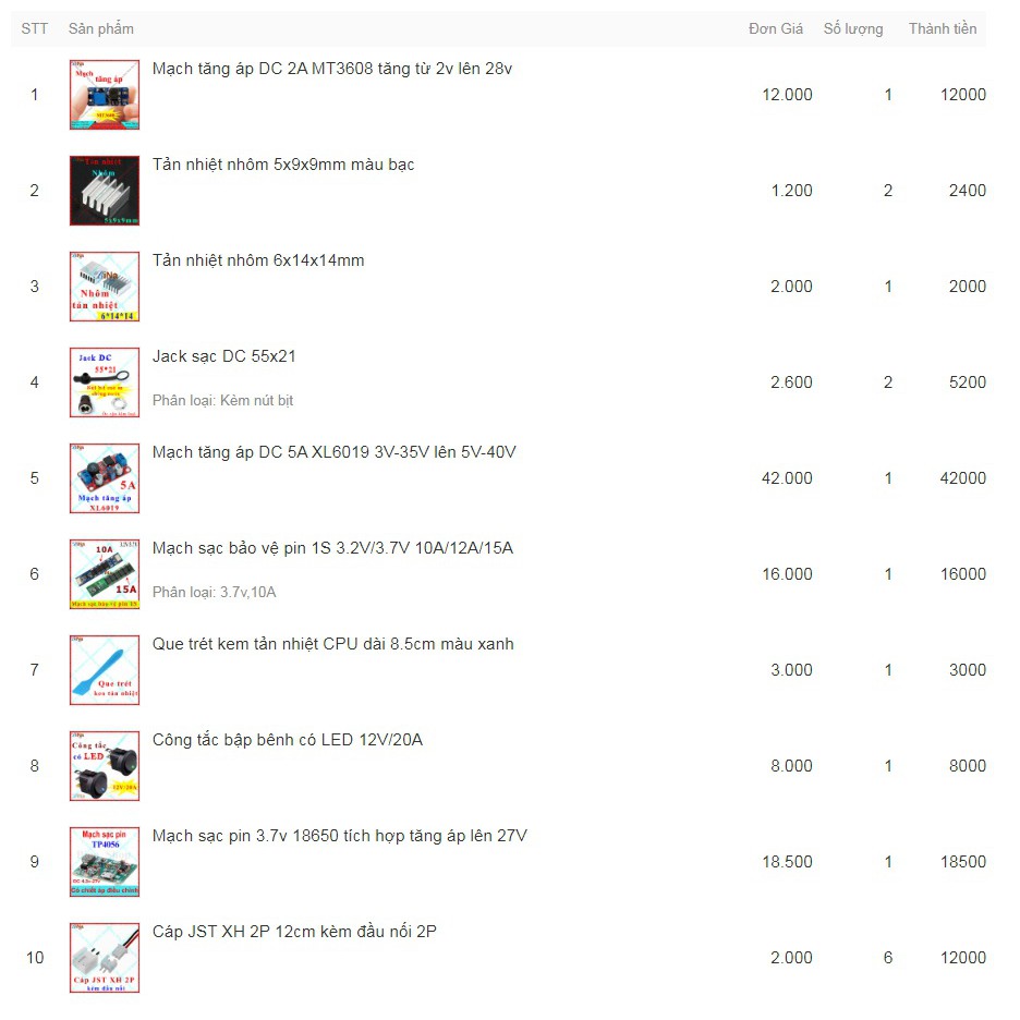 [Combo] Mạch sạc bảo vệ pin 18650 + Mạch tăng áp + Tản nhiệt nhôm + Công tắc LED + Jack sạc DC + Đế pin + Kem tản nhiệtBộ sản phẩm : bao gồm đầy đủ số lượng các sản phẩm được chọn trong hình chụp giỏ hàng (ảnh 2,3)