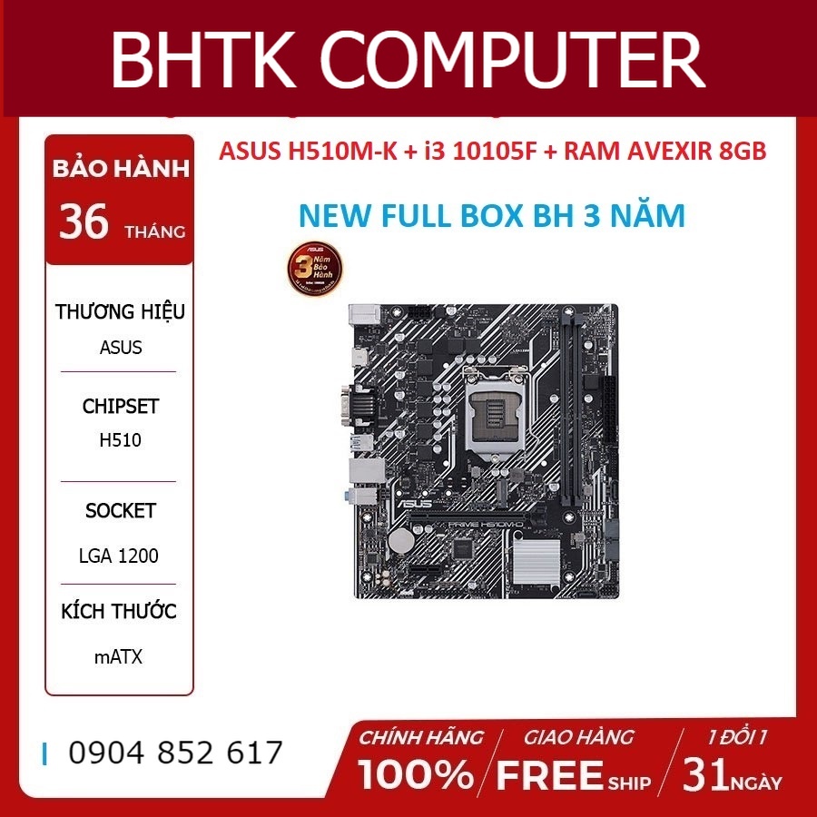 Combo Main + Chip + Ram(Asus H510M-K + i3 10105F + Avexir or Lexar 8gb 2666) Hàng mới full hộp chính hãng BH 36 tháng