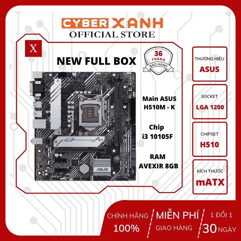 Combo Main + Chip + Ram(Asus H510M-K + i3 10105F + Avexir or Lexar 8gb 2666) Hàng mới full hộp chính hãng BH 36 tháng