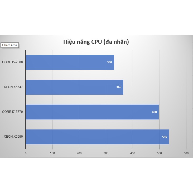 1 CPU X5670 - 6 nhân 12 luồng (Turbo 3.33), X5650 - 6 nhân 12 luồng (Turbo 3.0 Ghz) hoặc X5550 4 nhân 8 luồng (Turbo 3.0Ghz). Combo X5550 thì hiệu năng đơn nhân sẽ thấp hơn i5-2500 khoảng 20% nhưng hiệu năng đa nhân thì hơn khoảng 10%. Trong khi giá cả chi ngang với combo H61 + i3 2100 + 8G RAM. X5650 hiệu năng đa nhân hơn cả i7-3770 khoảng 10%. Nhưng giá chỉ ngang với combo H61 + i5 2500 + 8G RAM