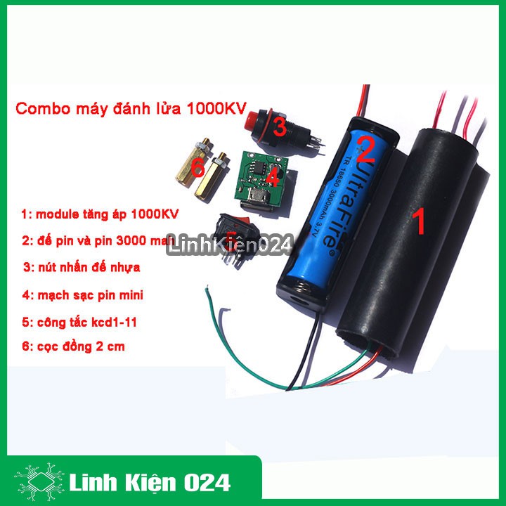 Combo máy đánh lửa 1000KV và phụ kiện: 01 moudle tăng áp 1000KV, 01 pin 3000mah, 01 đế pin 18650x1, 01 nút đề nhựa, 01 công tắc kcd1-11, 01 mạch sạc pin mini, 02 cọc đồng 2cm + ốcModule tăng áp 1000KV là bộ chuyển đổi điện áp từ 3.7 - 6V lên đến 1000KV, được chế tạo làm dụng cụ tự vệ tiện lợi, hoặc được dùng làm sạc pin dự phòng cho điện thoại di động.