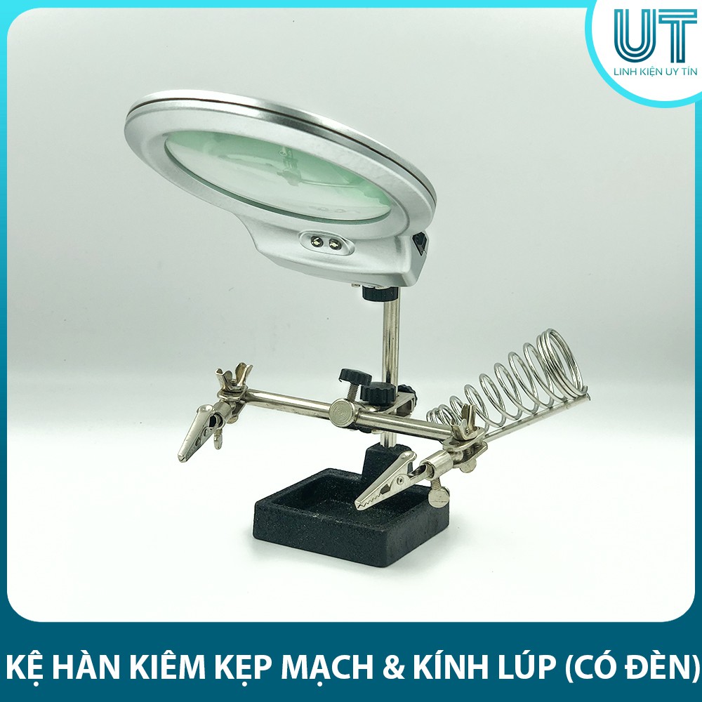 - Kệ hàn sẽ có kẹp mạch và kính lúp ngoài ra còn có đèn soi hỗ trợ kính lúp