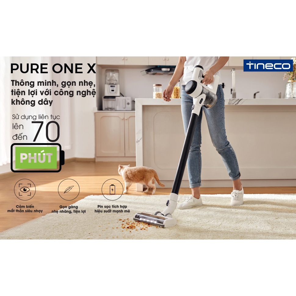 👉Pure One X là máy hút bụi không dây thông minh được tối ưu hóa cho khả năng hút siêu êm nhưng mạnh mẽ với thời gian chạy kéo dài lên đến 70 phút. Máy có Công nghệ cảm biến thông minh iLoop ™ của Tineco, cảm biến ẩn bụi bẩn và mảnh vụn trên sàn nhà của bạn và tự động điều chỉnh công suất hút để làm sạch hoàn toàn thảm và sàn cứng.