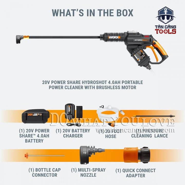 + WORX Hydroshot là một phần của nền tảng pin chia sẻ năng lượng WORX 20V, cho phép bạn chia sẻ pin li-ion 20V Max với các công cụ DIY & Garden khác của WORX.