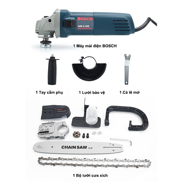 Mua 1 lần được 2 sản phẩm - Combo Máy Mài Bosch và Lưỡi Cưa Xích gắn máy mài – Biến chiếc máy mài, máy cắt trở thành máy cưa một cách đơn giản và dễ dàng.THÔNG TIN SẢN PHẨM MÁY MÀI BOSCH: