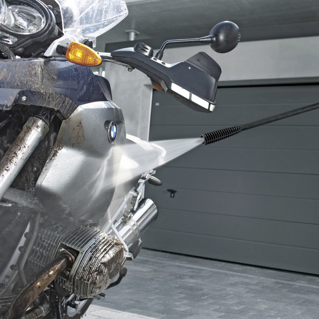 - Máy xịt rửa xe sử dụng động cơ chổi than. Áp lực mạnh 110 bar.