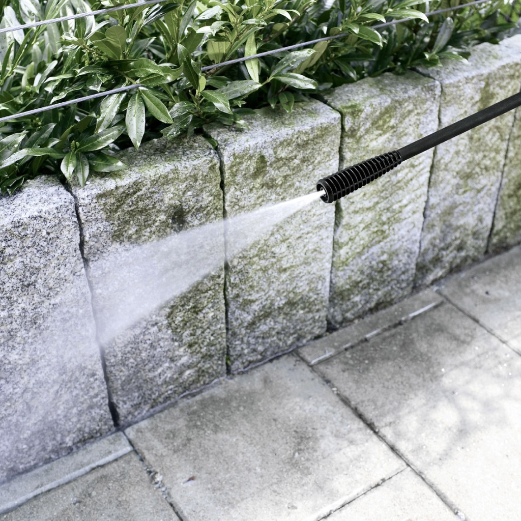 - Máy xịt rửa áp lực cao được tích hợp với 1 vòi phun thẳng không tùy chỉnh được áp lực 110 bar, kết nối dây áp lực dài 3 mét, giúp việc làm sạch, xịt rửa xe, rong rêu tường nhà cũng rất đơn giản và nhanh gọn.