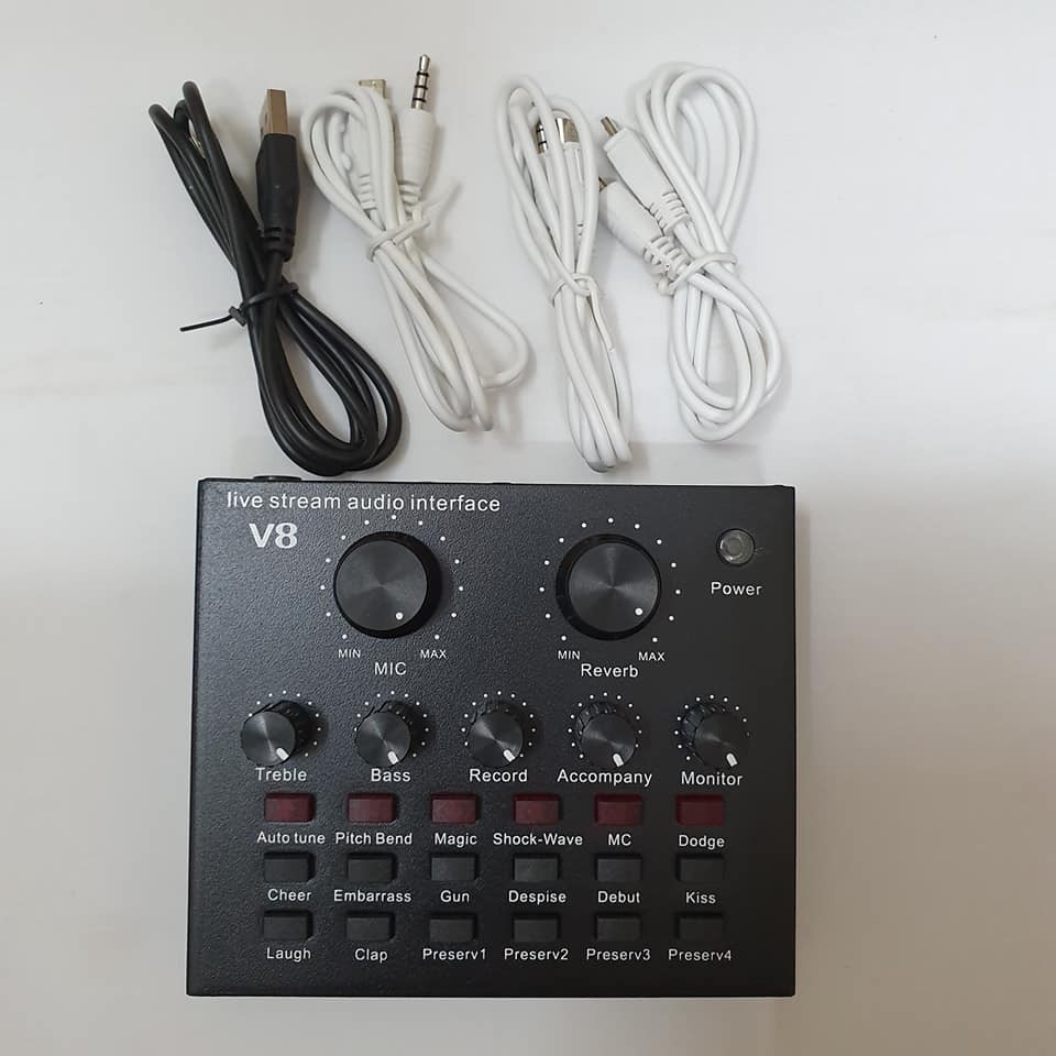 Sound card thu âm V8 là sản phẩm card âm thanh tương thích với nhiều thiết bị như smartphone, laptop, pc, máy tính bảng. Với tính năng làm méo giọng hát, thành giọng trẻ em, người già, Khả năng chèn các hiệu ứng âm thanh vào các đoạn thu như tiếng vỗ tay, tiếng hò reo, nhạc cổ vũ, tiếng chim kêu... với 12 hiệu ứng âm thanh, sẽ đem lại cho bạn trải nghiệm thu âm vô cùng thú vị.