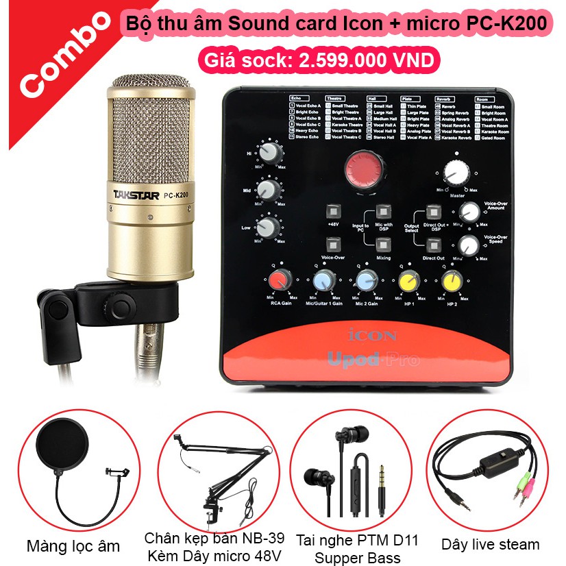 Thiết Bị Âm Thanh > Micro thu âm || ComBo mic livestream hát karaoke takstar PC-k200,card icon,dây live 3 màu,màng lọc, chân kẹp nb39TẶNG Tai nghe PTM -D11Còn hàng