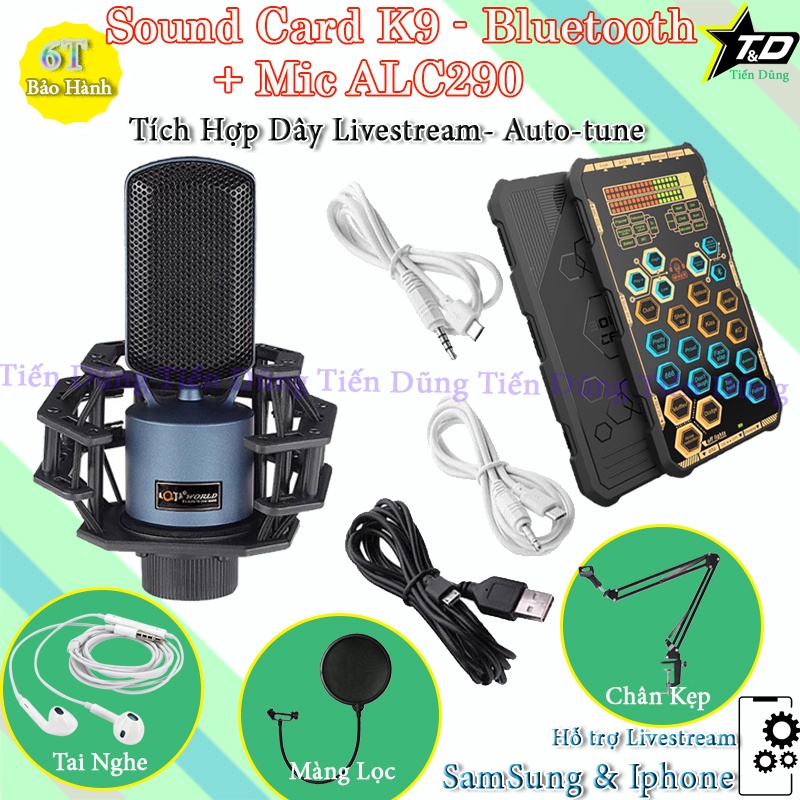 Thiết Bị Âm Thanh > Micro thu âm || Combo Mic Livestream Karaoke Aqta ALC290 và Sound Card K9 có Bluetooth Auto-tune Đi Kèm Chân Kẹp Màng Lọc Tặng Tai NgheCòn hàng