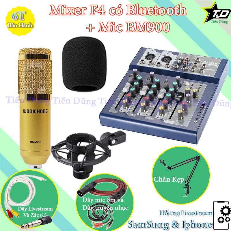 Combo mic thu âm bm900 bàn mixer f4 bluetooth chân dây ma2 zắc 6.5 dây truyền nhạc- Bộ mic thu âm đầy đủ