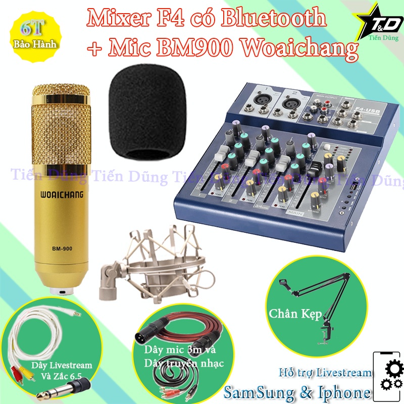 Combo mic thu âm bm900 woaichang shockmourt kim loại với Mixer F4 chân dây livestream chế dây mic 3m zắc 6.5 dây nhạc