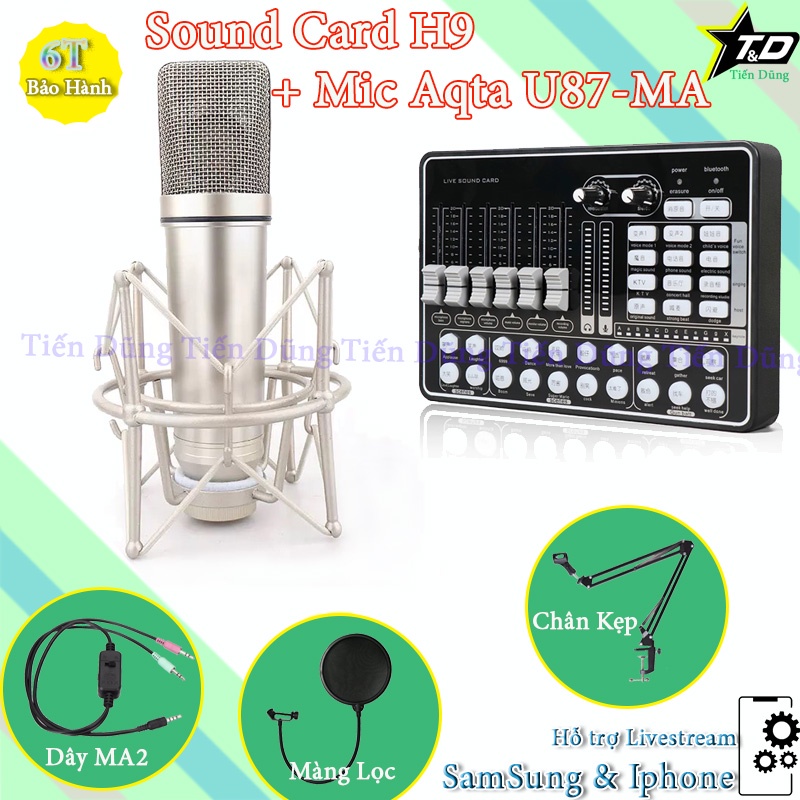 Bộ Combo Mic Thu Âm Karaoke U87 MA và Sound Card H9 Có Bluetooth Auto-tune Đi Kèm Dây Livestream MA2 Chân Kẹp Màng Lọc
