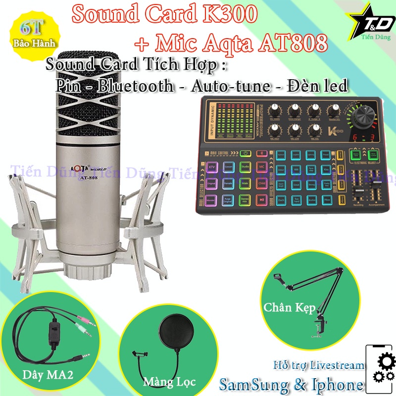 Combo mic thu âm kiêm karaoke Aqta AT808 và sound card K300 có bluetooth Auto-tune đi dây ma2 kèm chân kẹp màng lọc