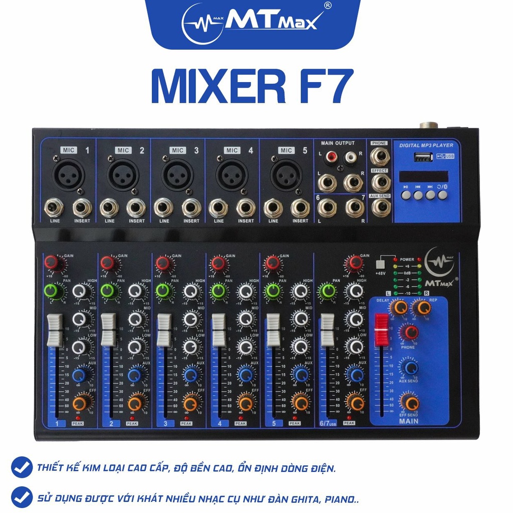 1.Bàn trộn Mixer MTMax F7 BT - 7 kênh cao cấp - Có bluetooth, chống hú tốt - Màn hình led hiển thị thông số - Hỗ trợ thu âm, livestream, karaoke online - Kết hợp được với loa kéo, amply, dàn karaoke