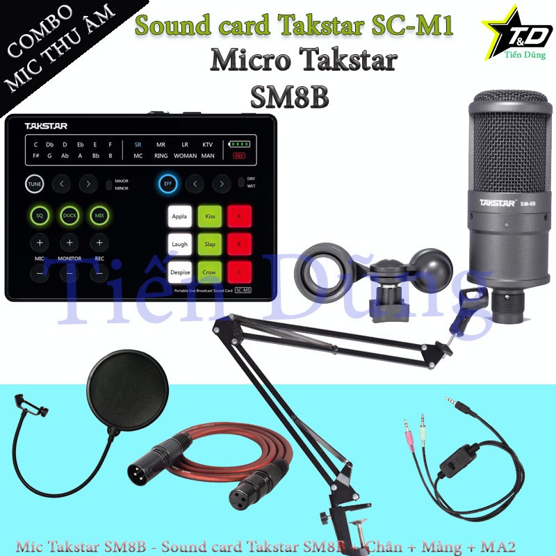 Combo Mic thu âm Takstar SM8B sound card SC M1 có autu tune tích hợp pin đi chân màng dây livestream MA2