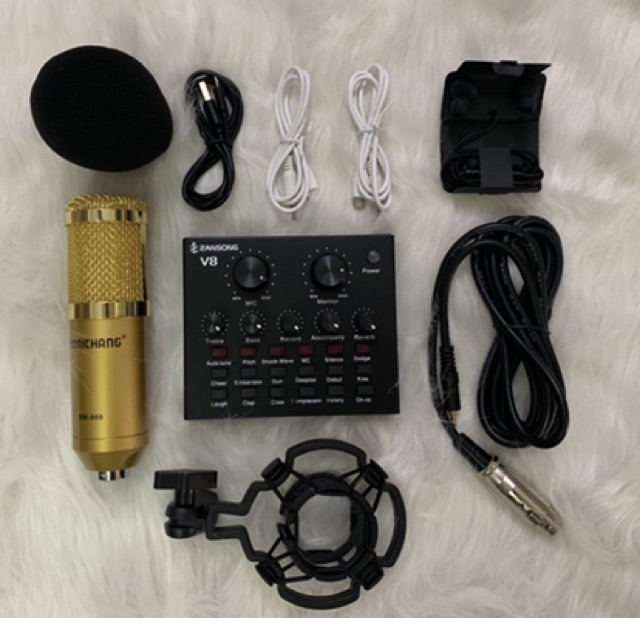 Combo mic thu âm bm-900 sound card V8 - 5 món bao gồm 5 món: Micro thu âm Ami BM900, sound card hát karaoke V8, màng lọc, giá đỡ micro, dây để livestream (trọn bộ không cần thêm bắt kỳ thiết bị nào khác)Bộ sản phẩm đầy đủ cho bạn thỏa sức thu âm những bài hát yêu thích.