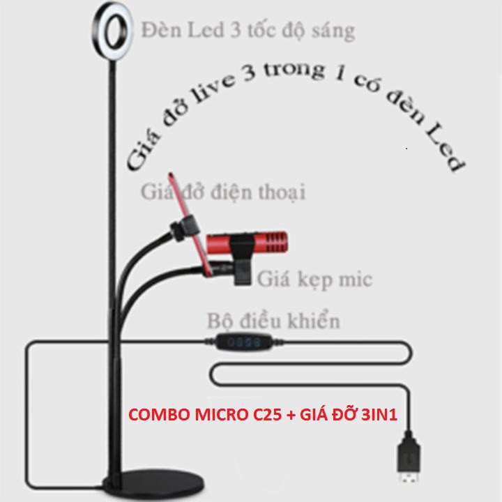 Combo Micro C25, Giá Đỡ Đèn 3in1, Tặng Tai Nghe - Mic C25 Livestream Hát Karaoke Giả Giọng Cực Hay New 2020