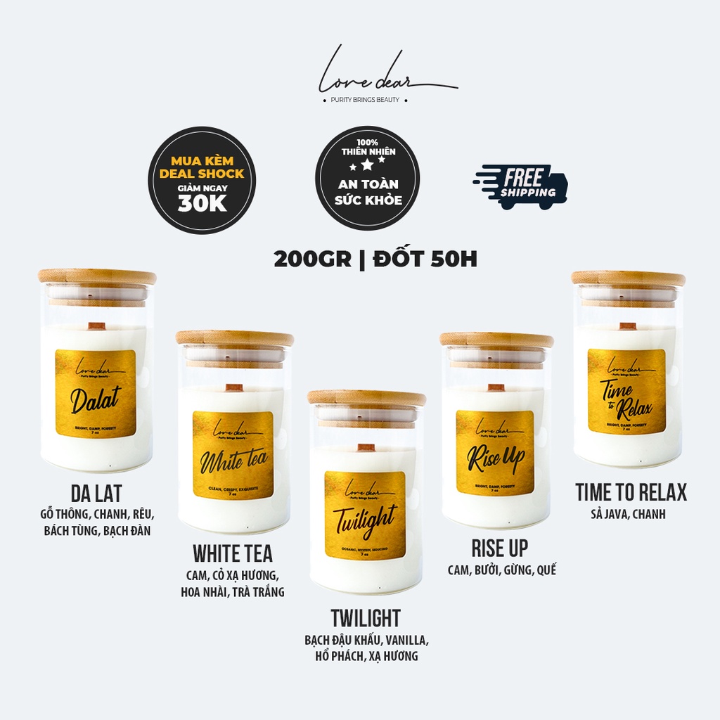 Với chiết xuất tinh dầu 100% thiên nhiên và được làm hoàn toàn bằng phương pháp thủ công, LoveDear đem lại cho bạn trải nghiệm hương thơm mới hoàn toàn, khác biệt, đầy tinh tế và êm dịu. Không chỉ giúp tinh thần thư giãn, tinh dầu tự nhiên dịu nhẹ trong nến còn giúp đuổi côn trùng, diệt khuẩn cho không khí, đem lại bầu không khí dễ chịu cho bạn.