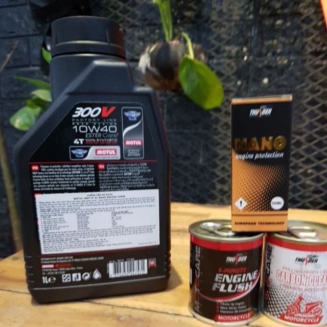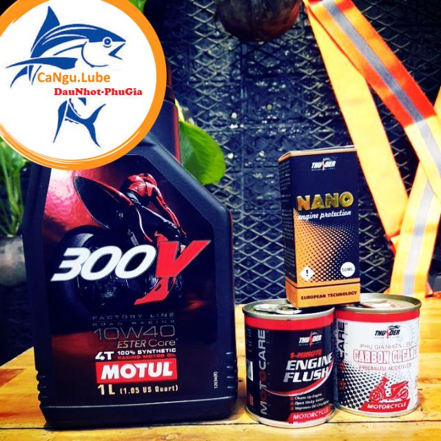Combo nhớt motul 300V 10w40, nhớt cao cấp và súc động cơ thunder, phụ gia xăng và phụ gia nhớt thunder