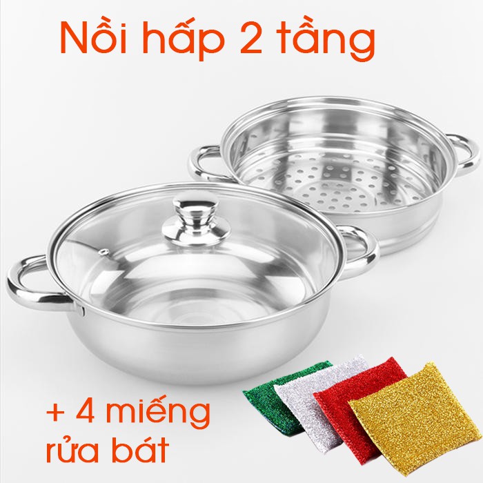 COMBO NỒI HẤP 2 TẦNG + 4 MIẾNG RỬA BÁT TIỆN LỢI🍀Điểm nổi bật :