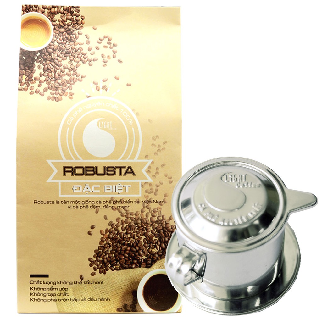 Combo phin pha cà phê inox cao cấp và cà phê bột nguyên chất 100% Robusta đặc biệt Light Coffee 500gr