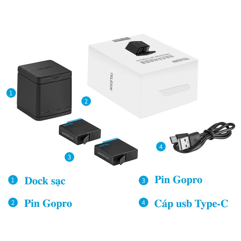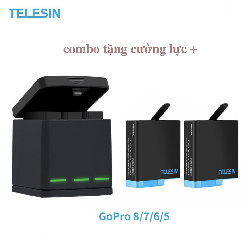 Cameras & Flycam > Phụ kiện máy ảnh > Khác || Combo pin sạc cho Gopro 5 6 7 8 black white silver - 2 pin 1 sạc chính hãng Telesin (tặng cường lực gopro tùy chọn)Còn hàng